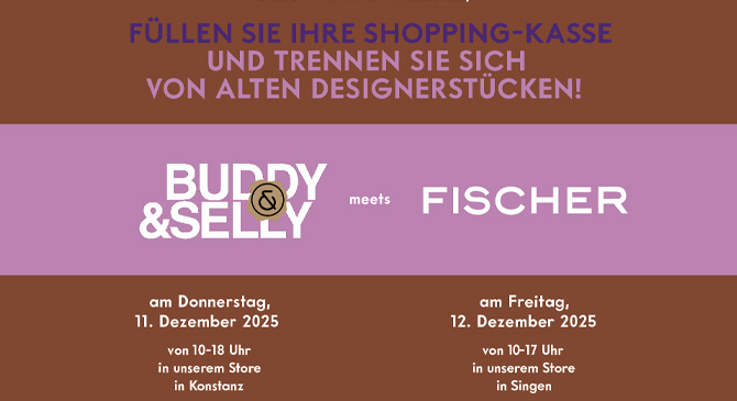Haben Sie Lust auf etwas Neues und keinen Platz im Kleiderschrank? Jetzt können Sie sich ganz einfach von Designermode, die Sie ausrangieren möchten, trennen und so Platz für neue Lieblingsstücke schaffen. BUDDY & SELLY und FISCHER laden Sie zu einem exklusiven Ankauf von Designermode, Taschen und Schuhen am Donnerstag, 11.12.2025 nach Konstanz von 10-18 Uhr und am Freitag, 12.12.2025 nach Singen von 10-17 Uhr ein.