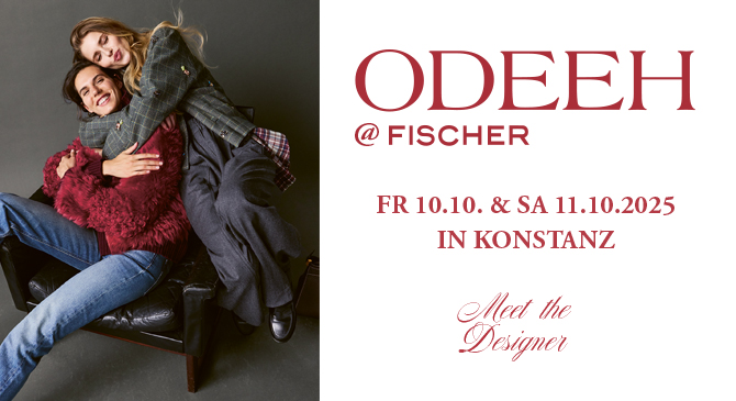 Wir freuen uns sehr, Sie am FR 10. 10. und SA 11. 10. 2025 herzlich in unserem Store in Konstanz begrüßen zu dürfen. Am Freitag wird Designer Jörg Ehrlich von ODEEH ab 12 Uhr persönlich anwesend sein. Am Samstag steht er Ihnen den ganzen Tag über zur Verfügung und präsentiert exklusiv die aktuelle Herbst/Winter 2025 Kollektion. Als besonderes Dankeschön erhalten Sie bei Ihrem Einkauf ein Überraschungsgeschenk von ODEEH.